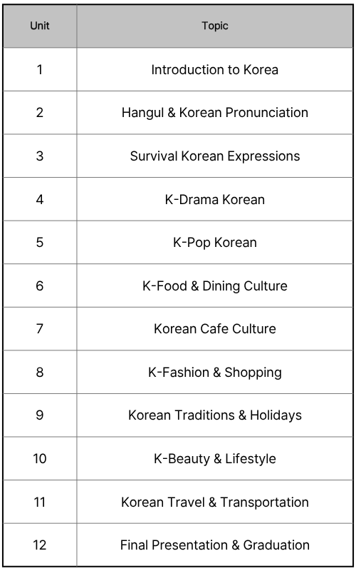 Learn Korean through K-pop, K-drama, food, and real-life situations. This course helps students improve their speaking skills while experiencing Korean culture in a fun and interactive way. Perfect for beginners and K-culture lovers.